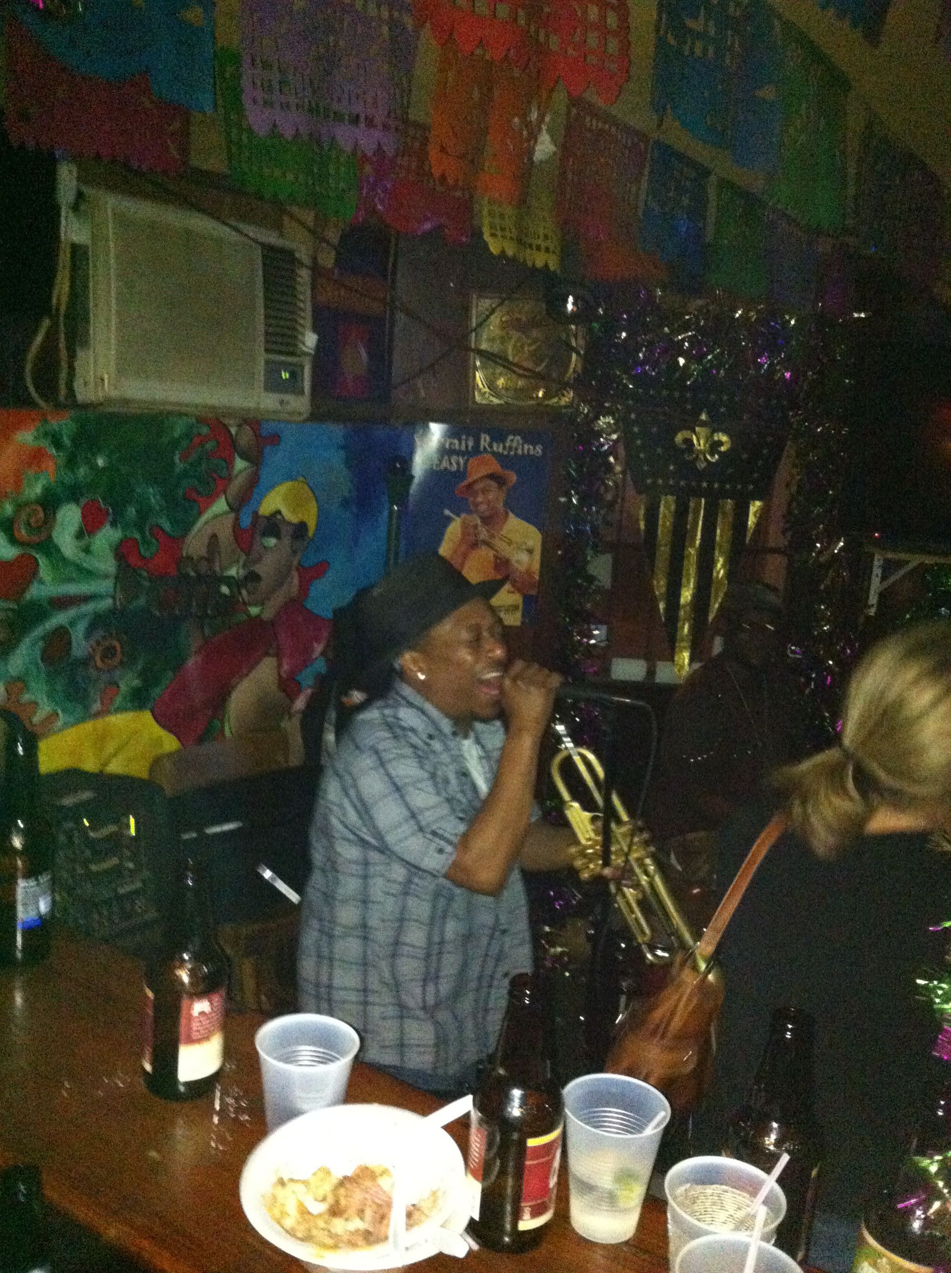 Ed eccomi in questo luogo sacro, mentre a fronte di una spesa di 10$ mangio carne BBQ con red beans e bevo una birra nell'attesa che Kermit alle 23.00 inizi il suo show. Musica d'attesa scelta da chi? Ma da lui, che gira per il locale con un iPad in wifi con DJMixer e alterna black a D&B ridendo e salutando tutti gli avventori. Verso le dieci e mezza arrivano 4 o 5 persone con gli strumenti e iniziano a fare il setting del piccolo palco. Alle undici meno un minuto Kermit Ruffins stacca l'iPad e tira fuori una tromba in do. Strano, penso, per fare jazz magari è più indicata una tromba in Si bemolle. Non si vede praticamente nulla. Io filmo un frammento del primo pezzo.